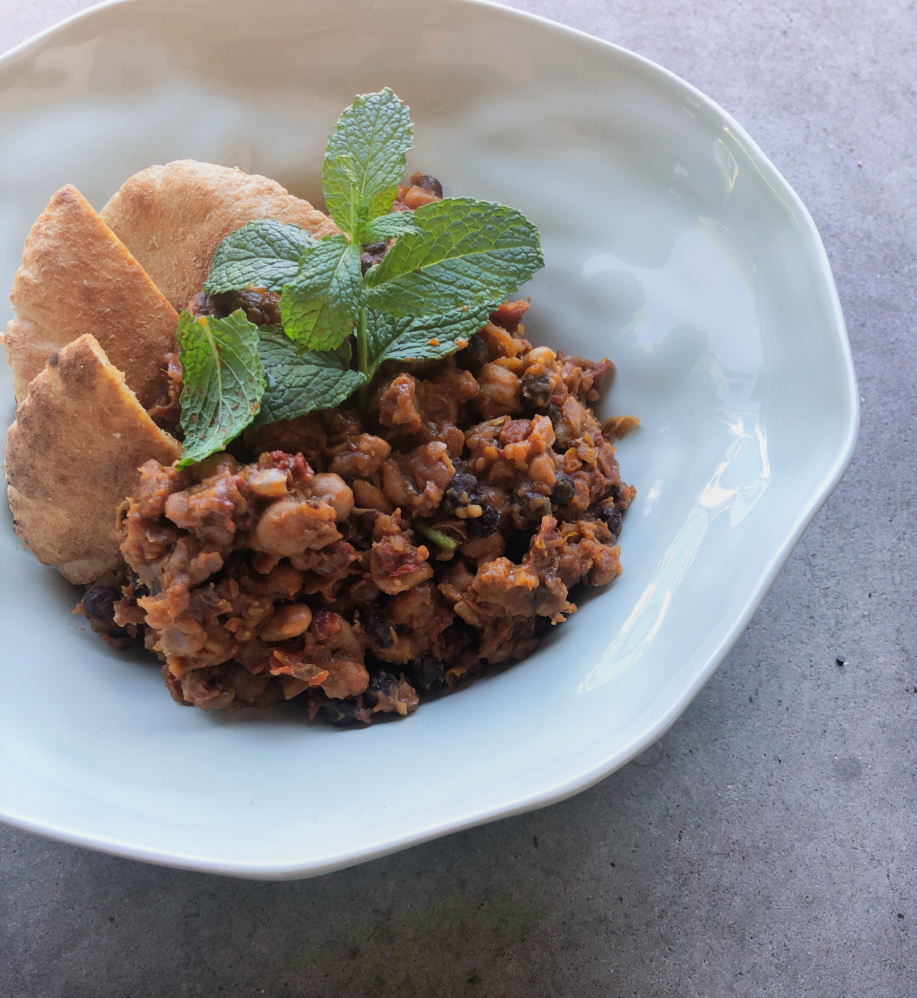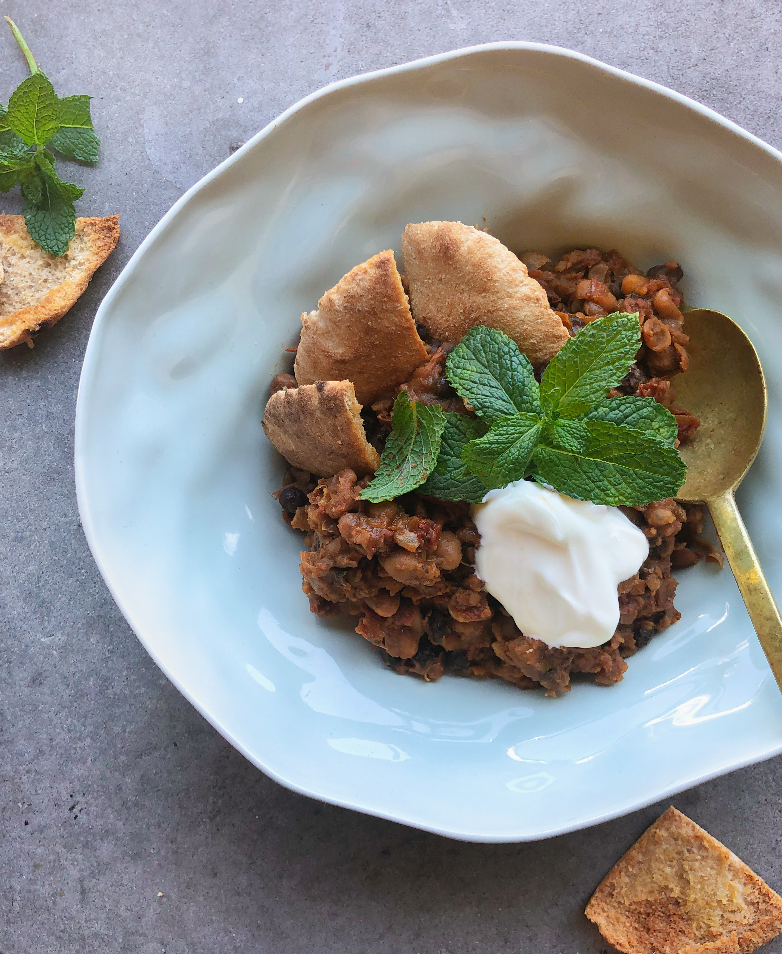 Preheat the oven to 180ºCCook the Moroccan Bean Tajine according to the packet instructionsWhile the meal is cooking, cut the pita breads up into triangles and place on a baking tray.Combine the garlic in some olive oil and brush over the bread. Place in the preheated oven and bake for 10 minutes until golden brown and crispy. Divide the tajine into two bowls. Add the pita breads, a dollop of yoghurt and some fresh mint to garnish.