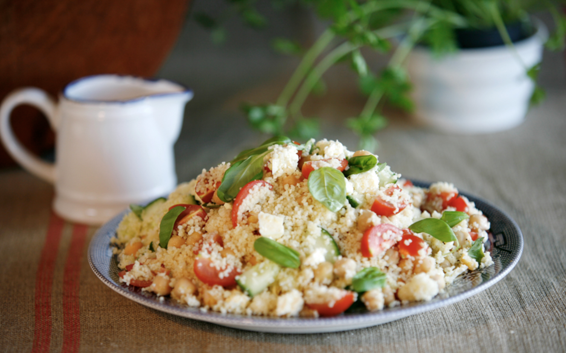 Add 450mLs of boiling water or stock to 250g of Alexandra’s French Couscous.Cover and leave for about 4 minutes. Fluff with a fork and drizzle over the olive oil.Stir through the cherry tomatoes, cucumber and chickpeas, and then squeeze over the juices of the lemon and lime. Season with salt and pepper and stir.