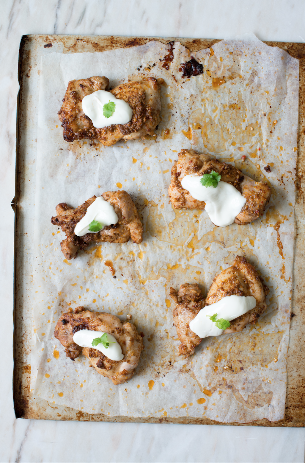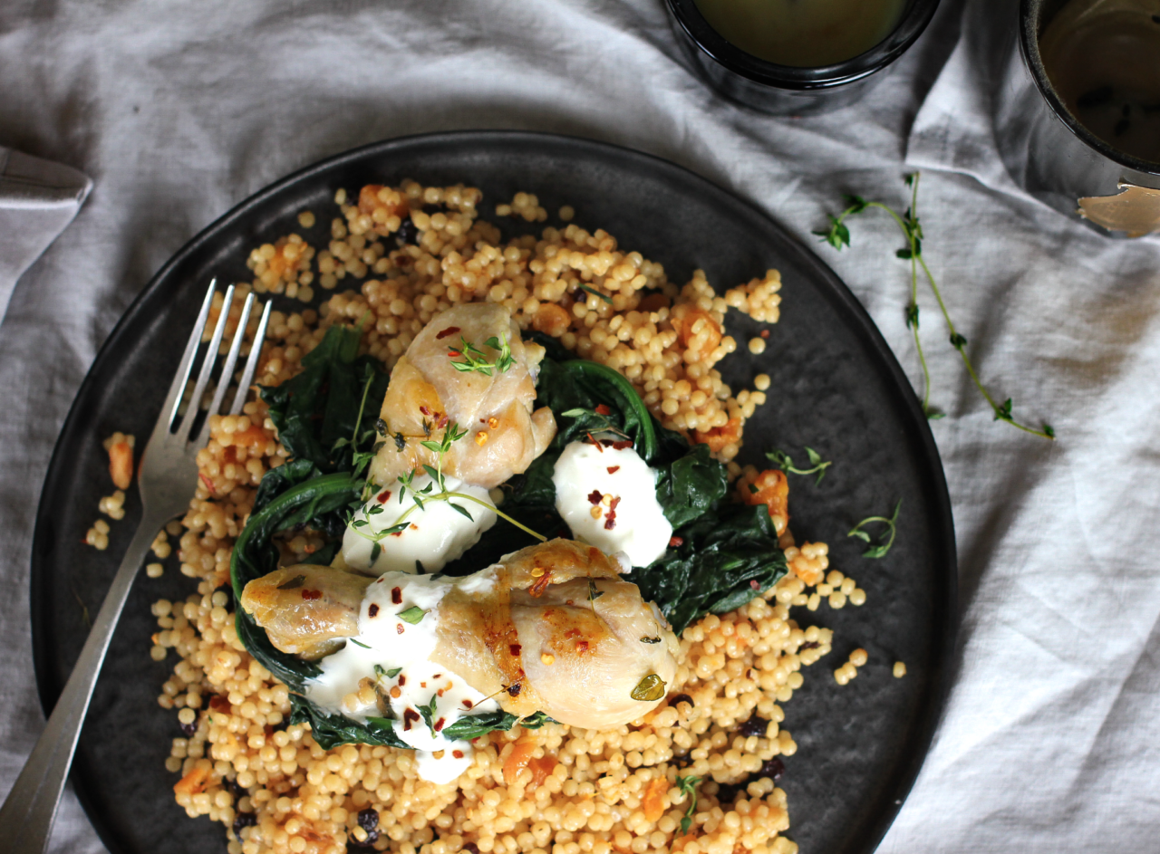 Heat a large frying pan over a medium-high heat and brown the chicken. Transfer to a roasting dish with any remaining marinade and roast chicken for 20 minutes or until cooked through.Heat the remaining 2 tablespoons of olive oil in a medium saucepan and cook moroccan couscous according to packet directions. Stir through a knob of butter before serving.Meanwhile, heat a large frying pan over medium heat. Place 1/2 of the spinach in the pan with the water that is clinging to its leaves and cook until wilted. Repeat with the remaining spinach.Serve the chicken thighs on a bed of couscous and spinach with the yoghurt.
