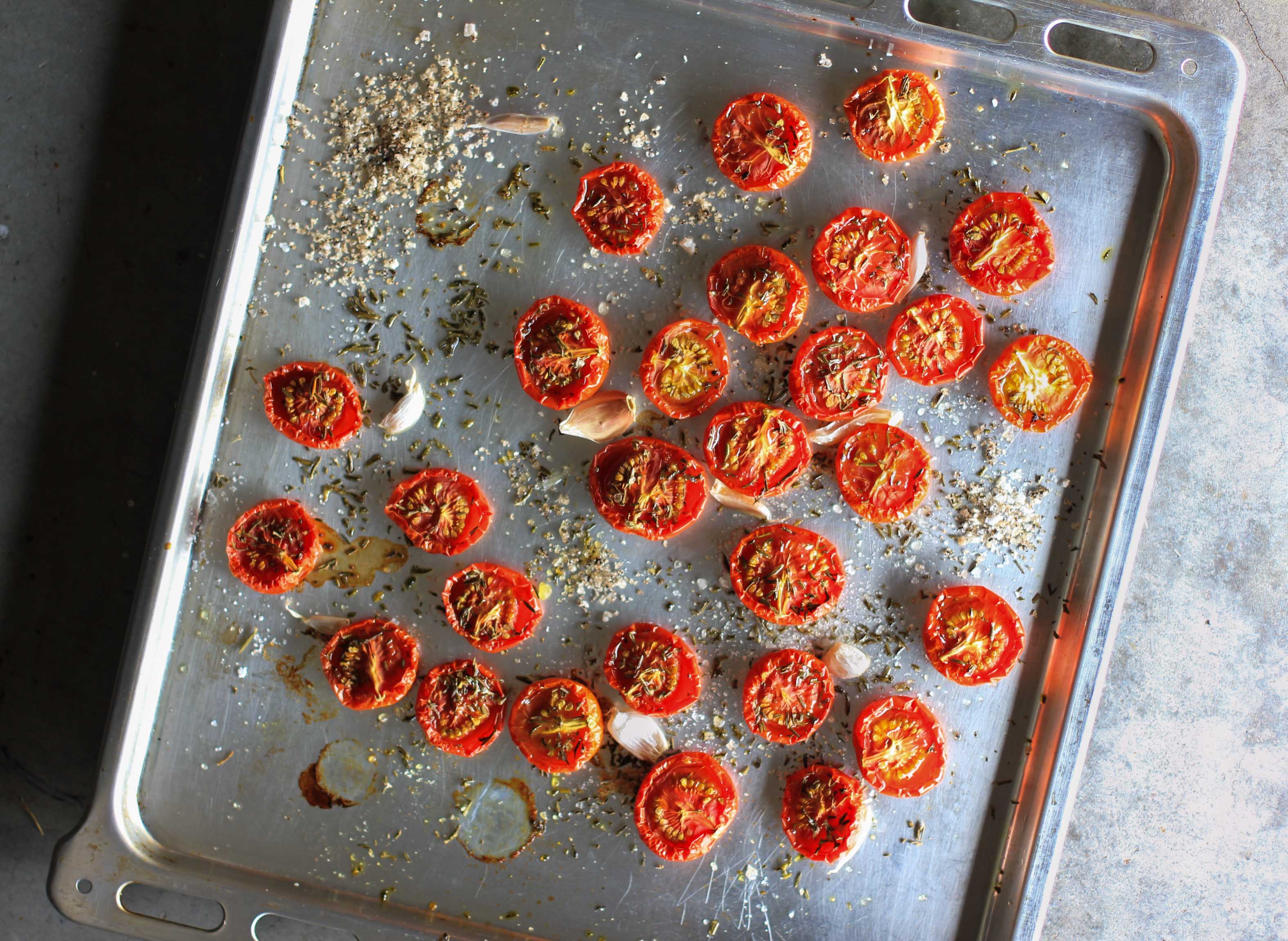 Heat oven to 100 degrees C. Rub a little olive oil on the bottom of a roasting pan. Toss tomatoes and garlic with a generous splash of olive oil and sprinkle with herbs, black garlic salt and pepper. Turn the tomatoes so they are cut side up in the pan and place garlic cloves, unpeeled between tomatoes. Cook for 3-4 hours, checking every hour and remove the garlic cloves after about an hour.Put the garlic aside to cook, then slip them off their peel.Tomatoes are done when you are satisfied with their texture. You can leave them plump and juicy, or leave them in to caramelize.Sprinkle with more Black Garlic Salt and enjoy!