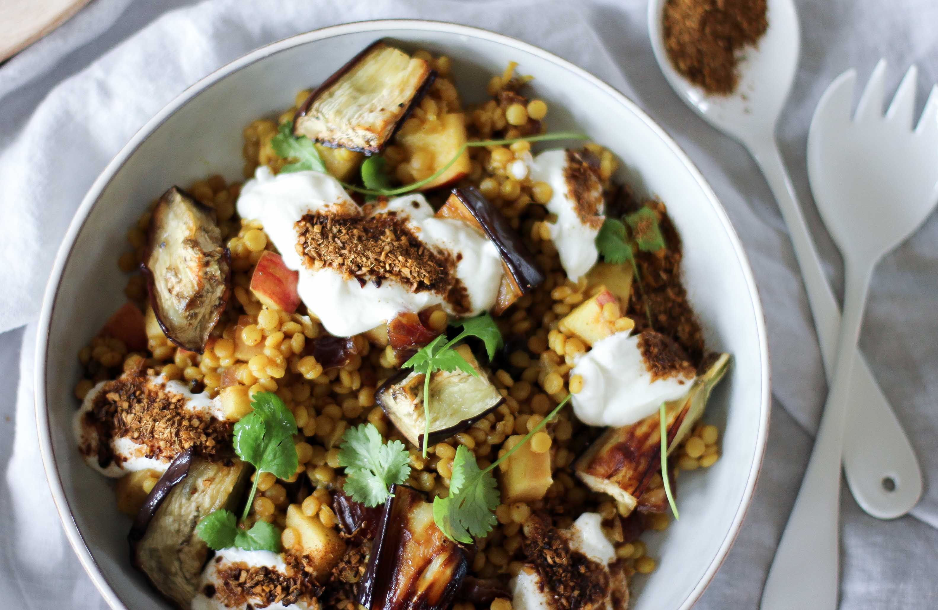Preheat the oven to 150ºC and line a baking tray with baking paper.Chop the eggplant into small cubes and place in a large mixing bowl with the dried herbs and 2 Tbsp of the olive oil.Mix until the cubes are roughly coated, and then place on the tray and into the oven. Roast for 25 minutes, then turn the eggplant cubes over and return the oven again for another 10 minutes, or until brown. Take care here to avoid burning.While the eggplant is roasting, gently sauté the onion in a saucepan with 1 Tbsp olive oil until soft and golden, then add another teaspoon of herbs, black pepper and the garlic. Stir for 1 minute, or until fragrant.Add the couscous and stir for a few minutes until the grains are coated and lightly toasted. Add the stock to cover the couscous (top up with water if needed) and bring to the boil. Reduce the heat to very low and cover with a lid.After 10 minutes or so, check the couscous and fluff with a fork. Loosen any stuck to the bottom of the pan. Cover again and cook for another 5 minutes, or until cooked through. Fluff again and set aside, covered.In a large bowl, mix together the couscous, eggplant and chopped herbs. Stir in the lemon juice and a little of the olive oil if needed. Season to taste.