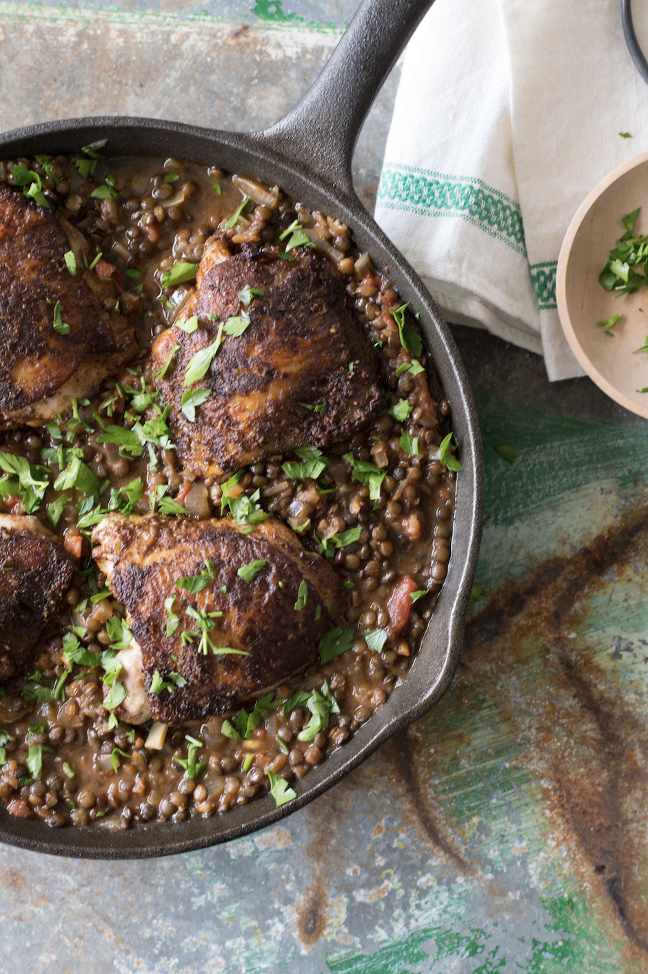 Preheat oven to 200 degrees C.Place the 2 Tbsp of olive oil in a heavy bottom pan. Saute diced onion, carrot, garlic and ginger until tender, about 5-7 minutes.Add the Berbere and saute for a futher 2-3 minutes.Add the lentils, tomatoes, salt and water. Bring to the boil, cover, reduce heat and cook until al dente, about 30 minutes.Pat chicken dry. Rub each piece with Berbere.Heat oil in a heavy bottom oven proof pan on medium heat. Place chicken skin side down and sear until crisp and golden, about 6-8 minutes. Reduce the heat, turn over and sear for a further 2-3 minutes.Place in the pre-heated oven and cook for a further 10-15 minutes until chicken is cooked through.Serve over bed of lentils, and garnish with fresh parsley.