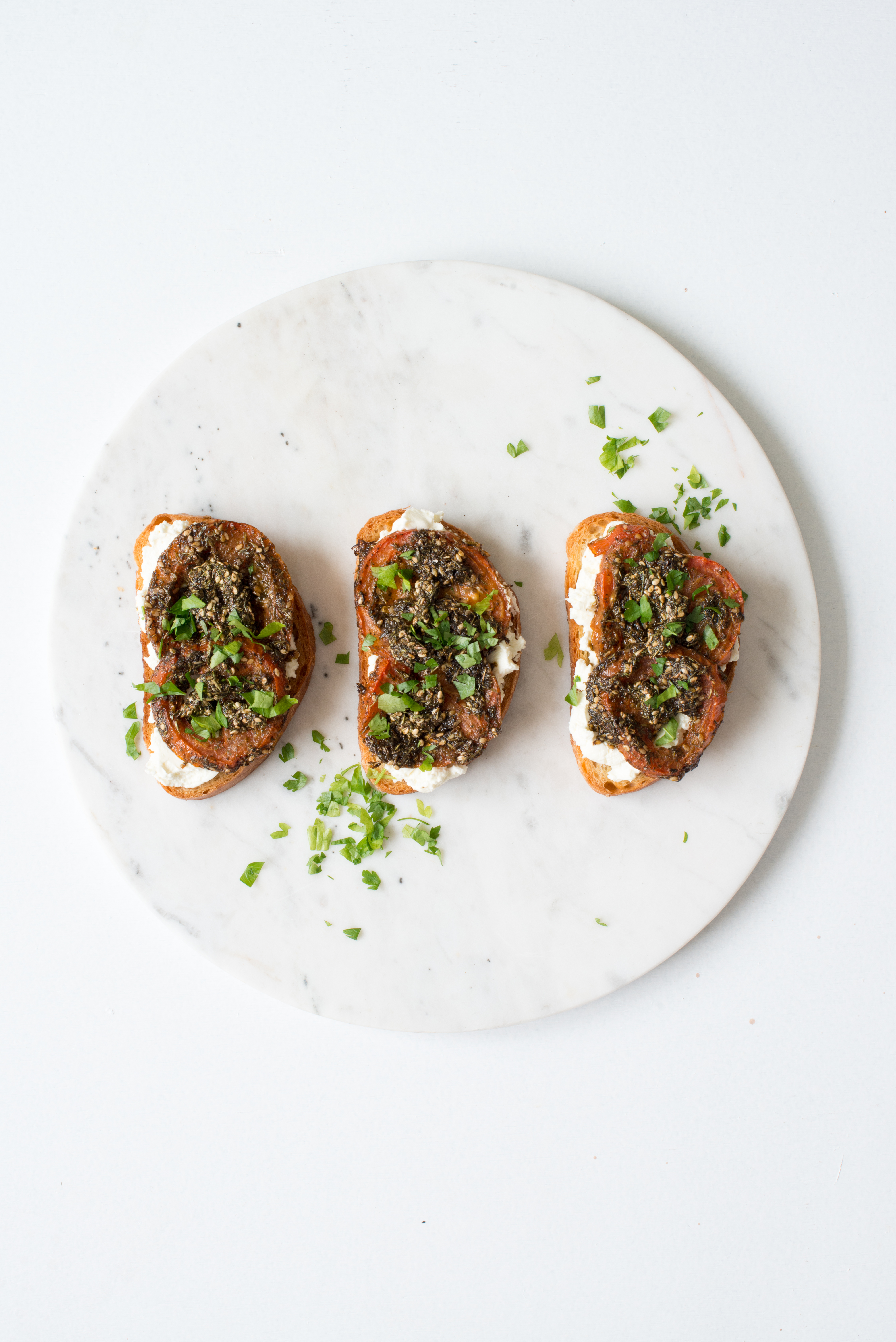 Season with salt and pepper and arrange on the oven tray.Roast in the oven for 20 – 25 minutes, until tomatoes begin to caramelize. Set aside.Reduce the oven to 180 degrees C. Prepare another oven tray lined with baking paper.Brush both sides of the sliced bread with the rest of the olive oil. Place on the tray and bake for 10 minutes, flipping halfway, until edges are golden.Smear a dollop of labneh on each crostini and top with tomato slices. Drizzle with more Zahtar paste and top with parsley.