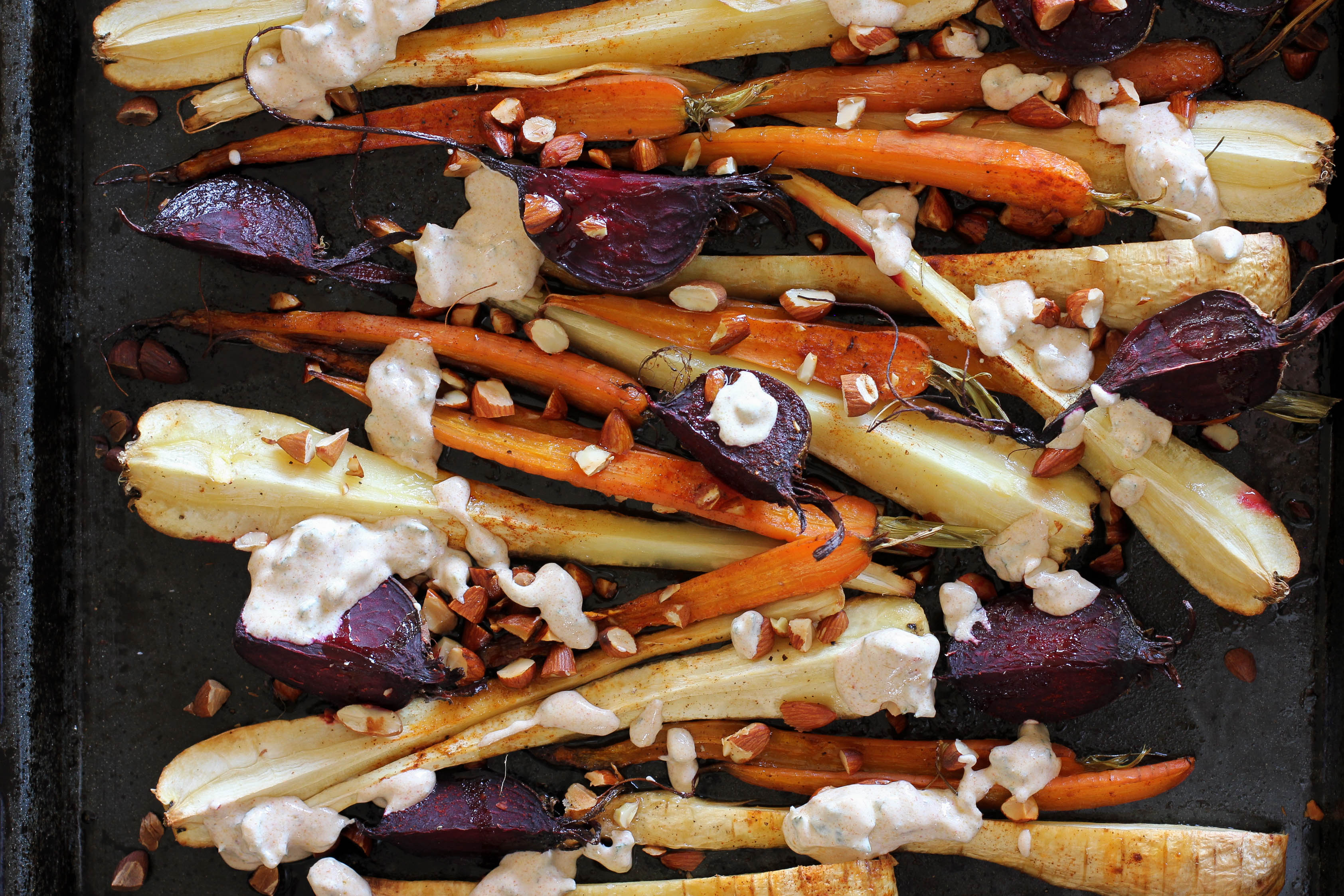 Preheat oven to 200 degrees CCut the carrots and parsnips in quarters or halves lengthways, and the beetroot into quartersPlace in a roasting dish and sprinkle over the almondsDrizzle with the coconut oil and honey mixtureSeason to taste with salt and pepperRoast for about 30-35 minutes until slightly crisp but cooked throughFor the dressing, whisk all ingredients together in a small bowl and season to tasteServe alongside or drizzle on top of the vegetables, and garnish with herbs